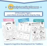 Combines basic doodles with pen control exercises, numbers, English, colour blending, and word puzzles for deeper learning.